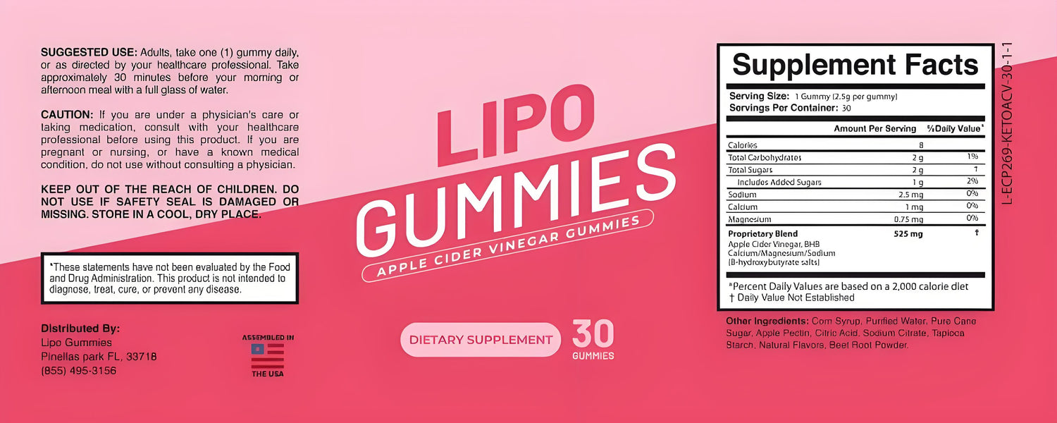 Lipo Gummies is a 100% natural, safe, and effective weight loss product. Thousands of people undergo treatment with Lipo Gummies every day without any reports of side effects. Each bottle is manufactured in the United States in state-of-the-art facilities approved by the FDA, ensuring the highest standards of excellence and quality in production. Rest assured that you are using a product that is safe and of the highest quality in your weight loss routine.